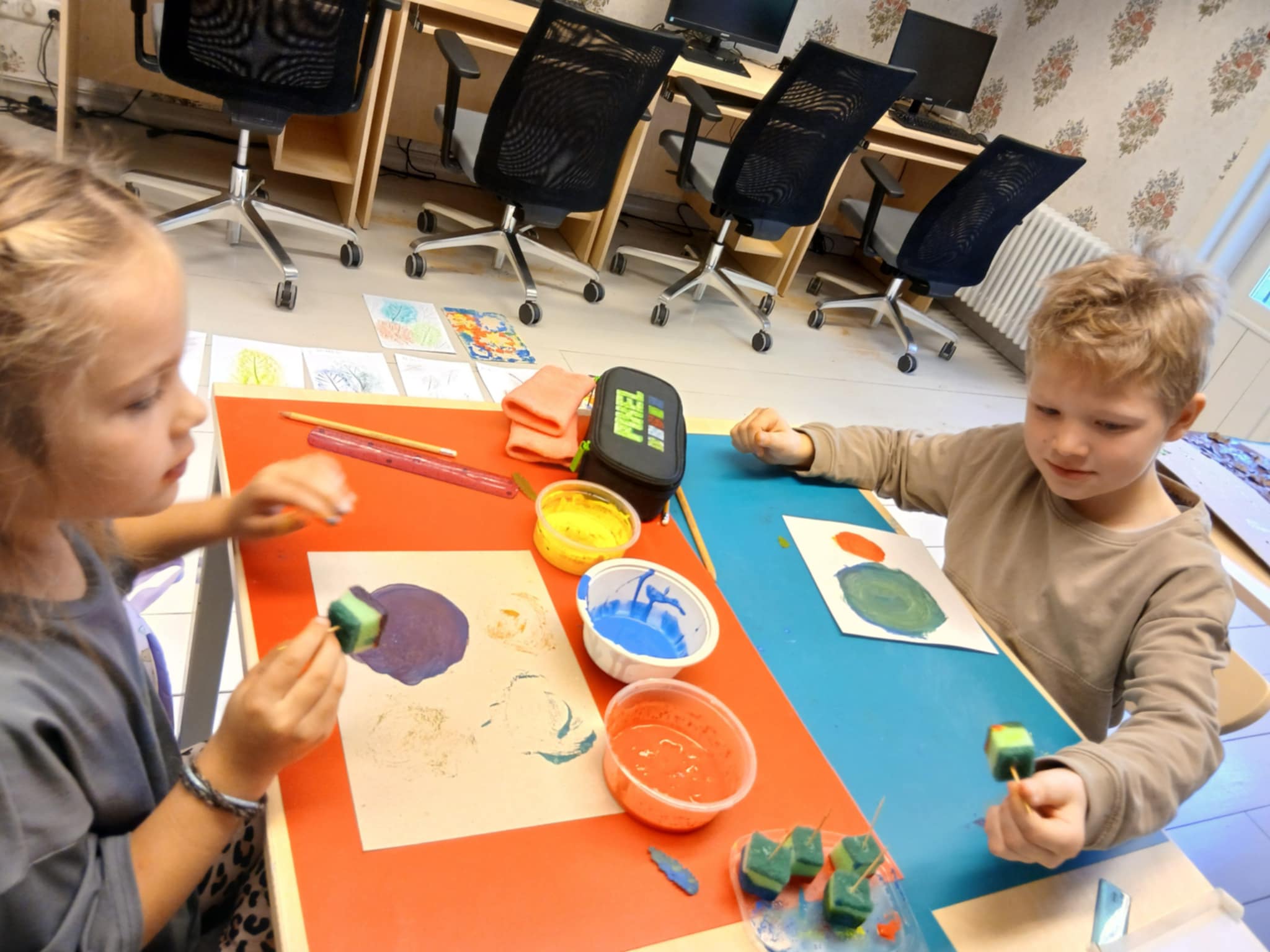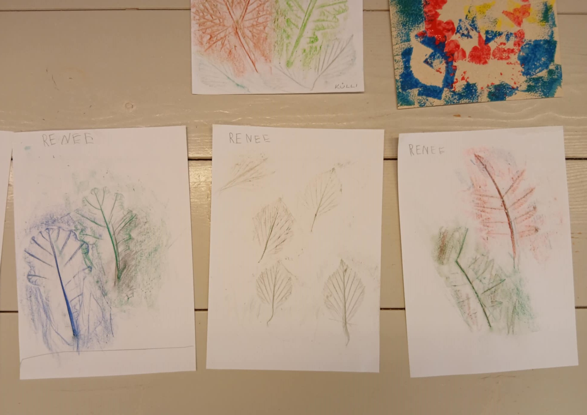 1. ja 2. klassi õpilased katsetasid frotaaži ja svammiga värvi tupsutamistehnikat. Sai selgeks, kuidas saada rohelist ja oranži, kui kasutada on ainult põhivärvid sinine, punane ja kollane.