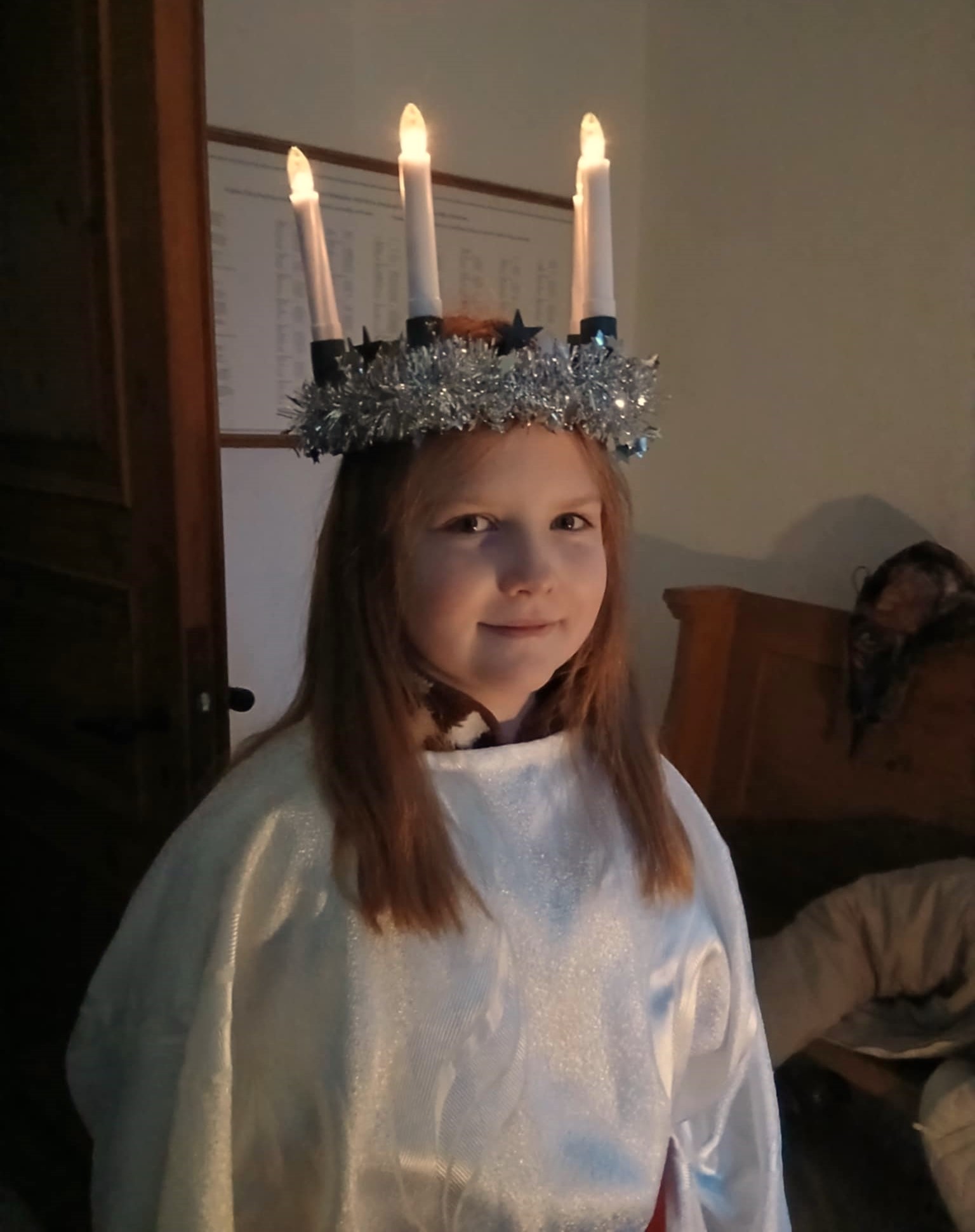 Teno Magda oli meie selle aasta Lucia ja juhtis kooliõpilaste väikese rongkäigu vana kiriku uksest sisse.
